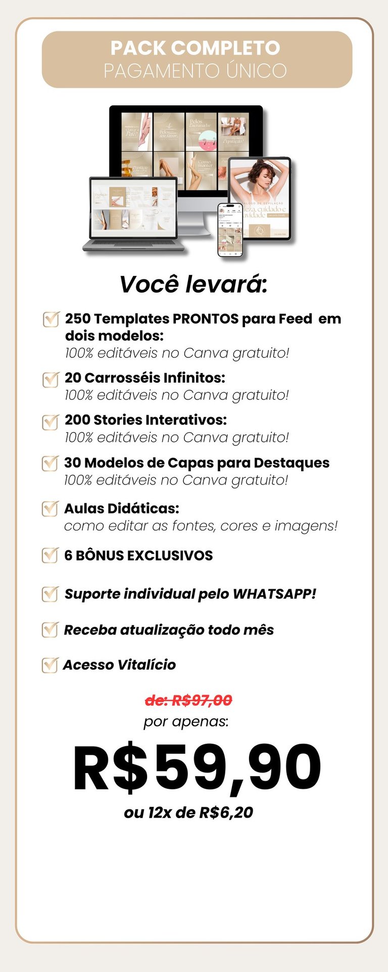 Tenha acesso a um pack exclusivo de Reels prontos, com estética clean, delicada e profissional, criados para valorizar seu conteúdo, atrair novos seguidores e transformar visualizações em clientes.